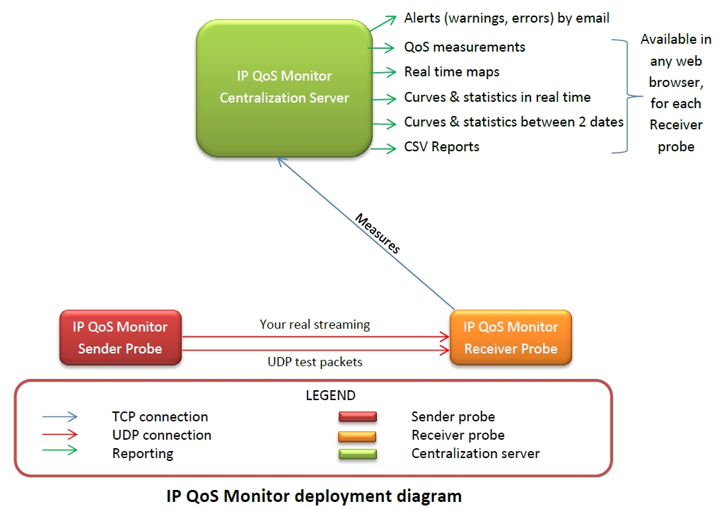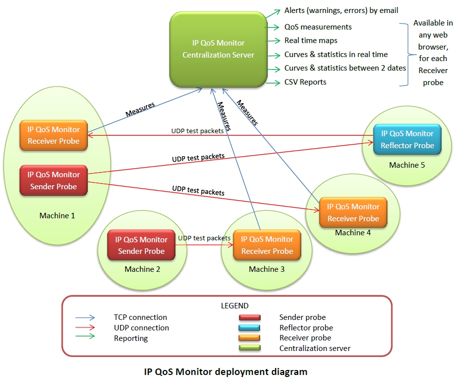 Moreover, IP QoS Monitor probes and servers are fast and a single PC can easily run several probes and/or several centralization servers. And a single Sender probe or Reflector probe can send test packets to multiple Receiver probes.