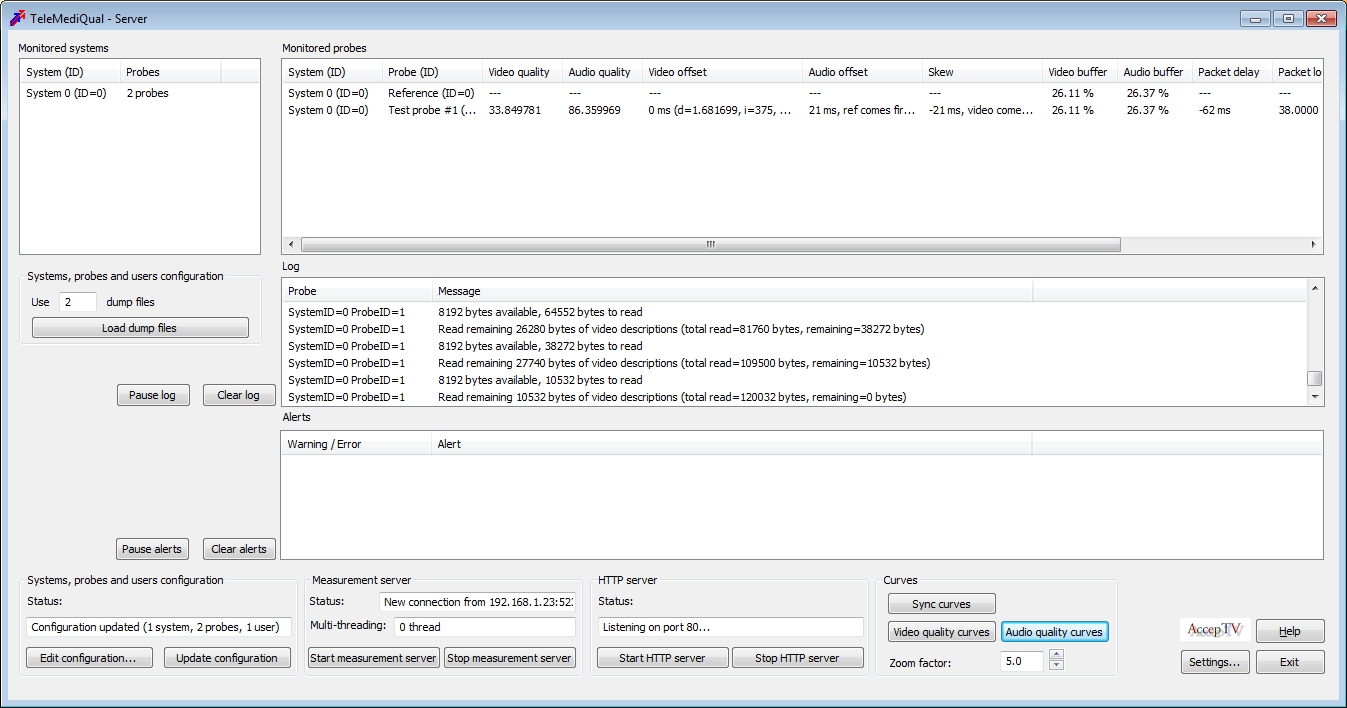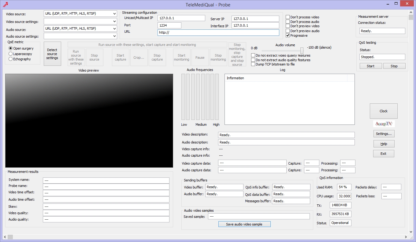 All along these steps, the rich interface of TeleMediQual Monitor indicates the detected parameters: detected devices, detected settings, detected resolution, detected audio sampling rate, etc. It also displays the levels of the internal buffers and a log window concerning the connection with the measurement server.